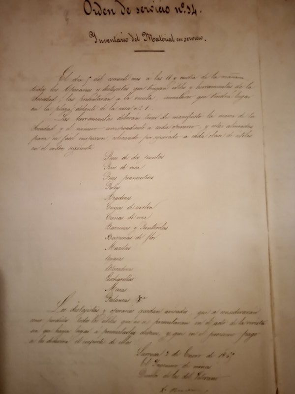 Orden de Servicio nº 14 on es descrivia l’inventari de les eines necessàries, que havien de presentar els «destajistas» (treballadors a preu fet), i operaris de manera periódica, a peu de cada boca-mina.1864.
